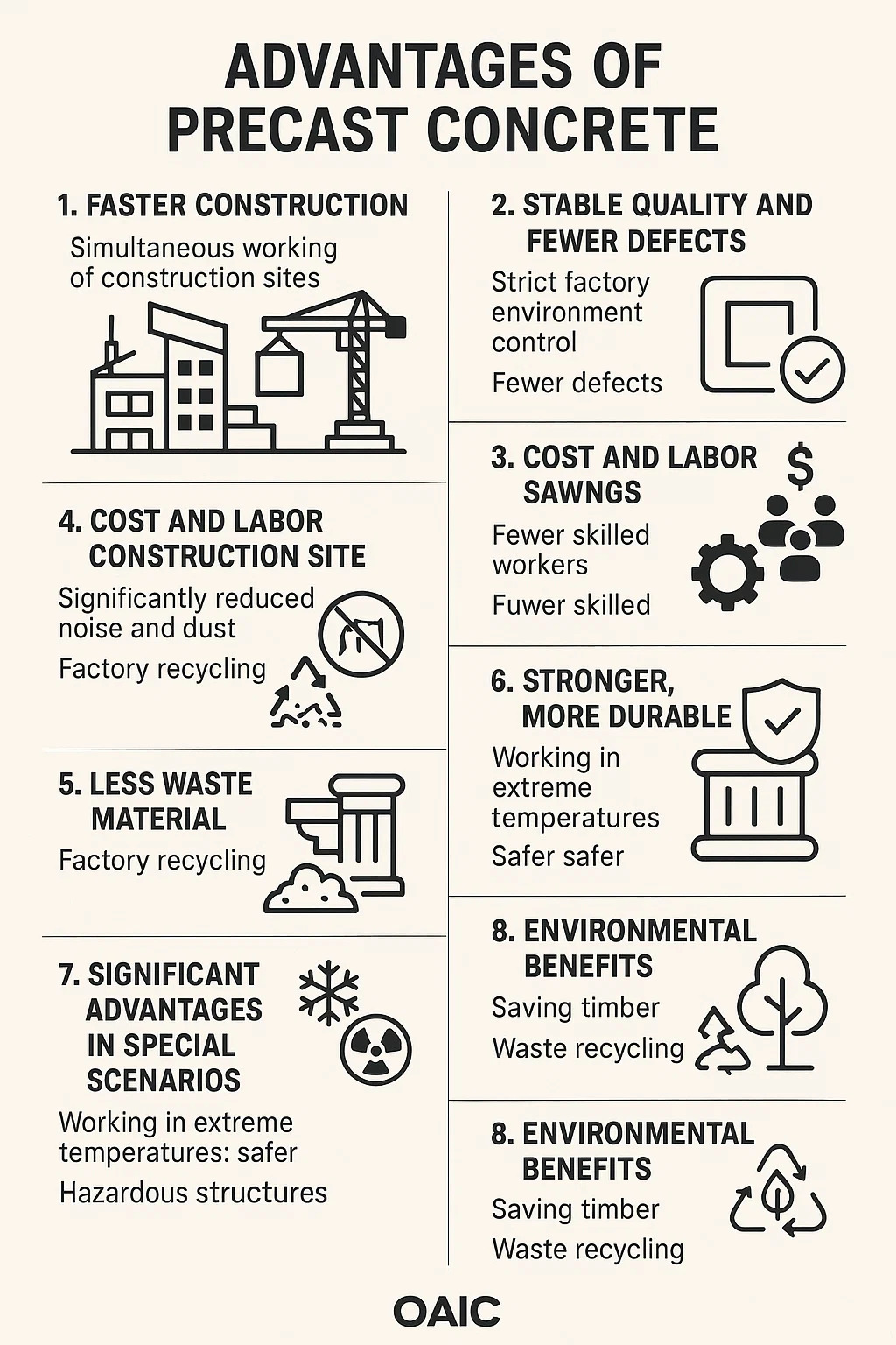 Wiederverwendbare Formen: Bei der Herstellung großer Mengen identischer Bauteile (z. B. Wohnheime) verteilen sich die Kosten für die Formen und sind damit kostengünstiger.