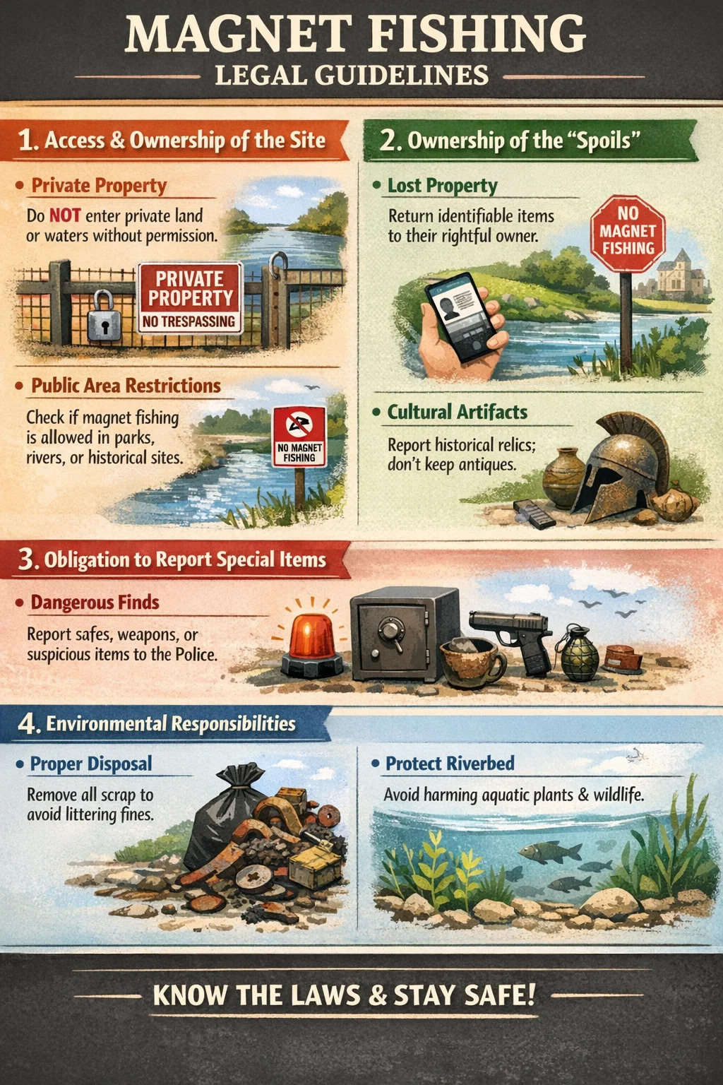 Bevor Sie mit dem Magnetfischen beginnen, ist es wichtig, die relevanten Gesetze und Vorschriften zu verstehen. Während diese Aktivität vielerorts als positive Möglichkeit zur Umweltsanierung angesehen wird, beinhaltet sie rechtlich gesehen verschiedene Aspekte wie Landrechte, Eigentum an geborgenen Gegenständen und öffentliche Sicherheit.