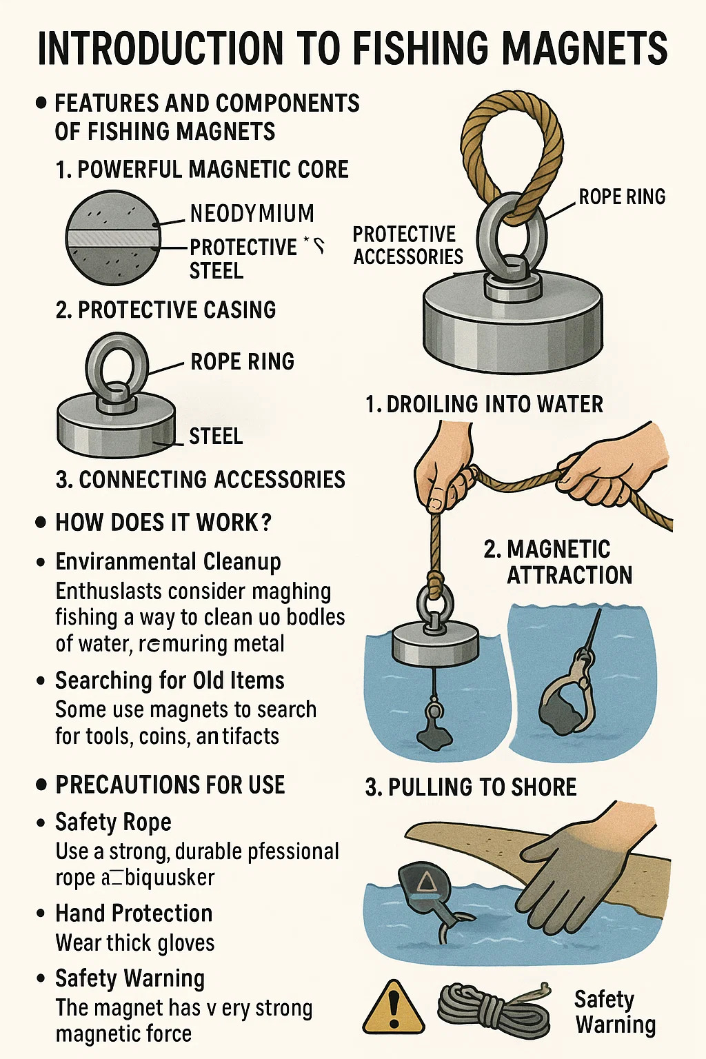 Ein Angelmagnet ist, wie der Name schon sagt, ein leistungsstarkes magnetisches Werkzeug, mit dem eisenhaltige Gegenstände am Grund von Gewässern oder an schwer zugänglichen Stellen „gefischt“ werden. Es nutzt eine starke Magnetkraft, um Metallgegenstände anzuziehen und zurückzuholen und ersetzt so herkömmliche Haken und Leinen.